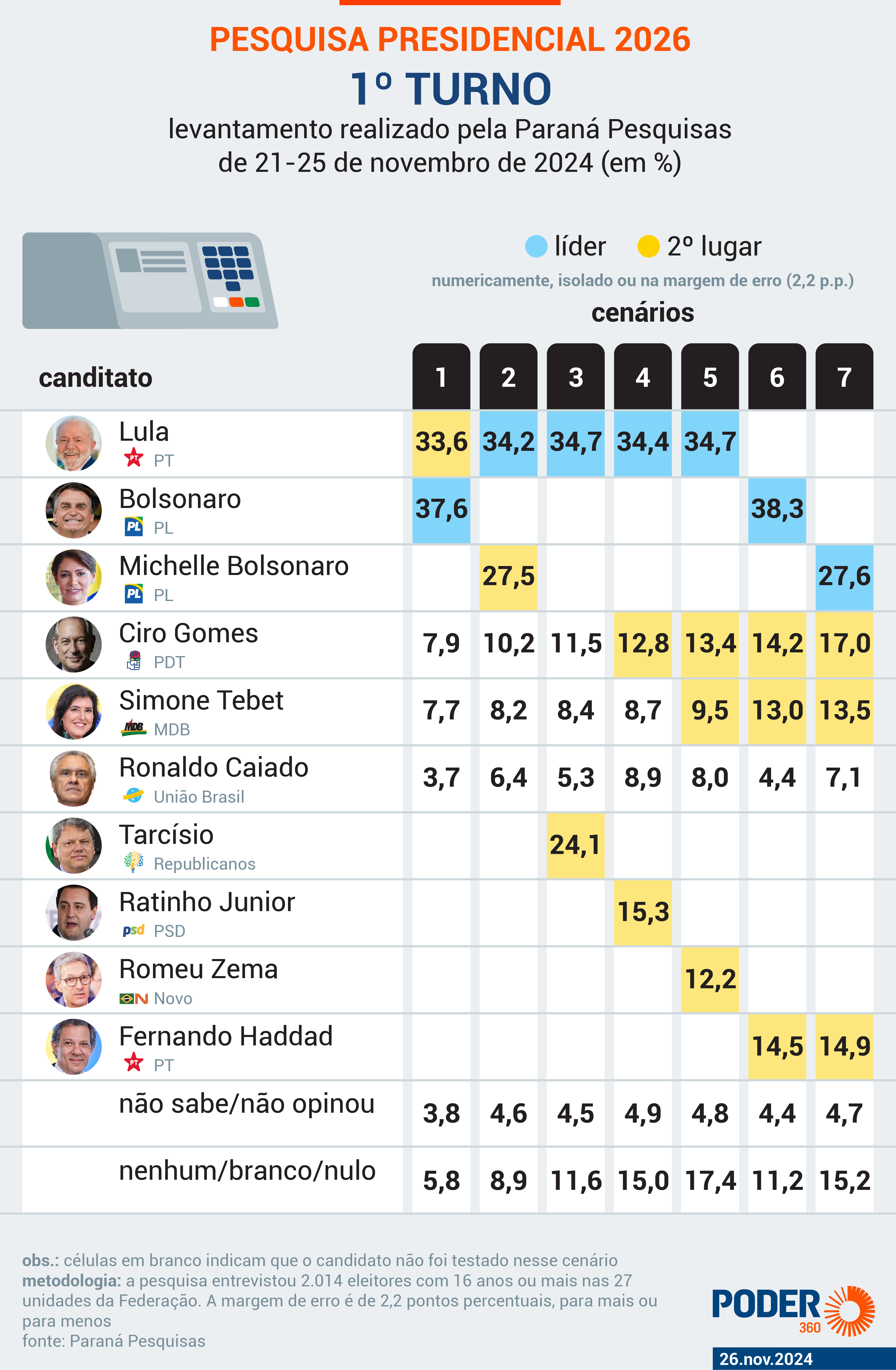 Se a eleição presidencial fosse hoje, Jair Bolsonaro (PL), que neste momento está inelegível, teria 37,6% dos votos contra 33,6% do atual ocupante do Palácio do Planalto, Luiz Inácio Lula da Silva (PT), segundo levantamento do Paraná Pesquisas realizado de 21 a 25 de novembro de 2024. Como a margem de erro do estudo é de 2,2 pontos percentuais, para mais ou para menos, os 2 pré-candidatos estão em situação de empate técnico.