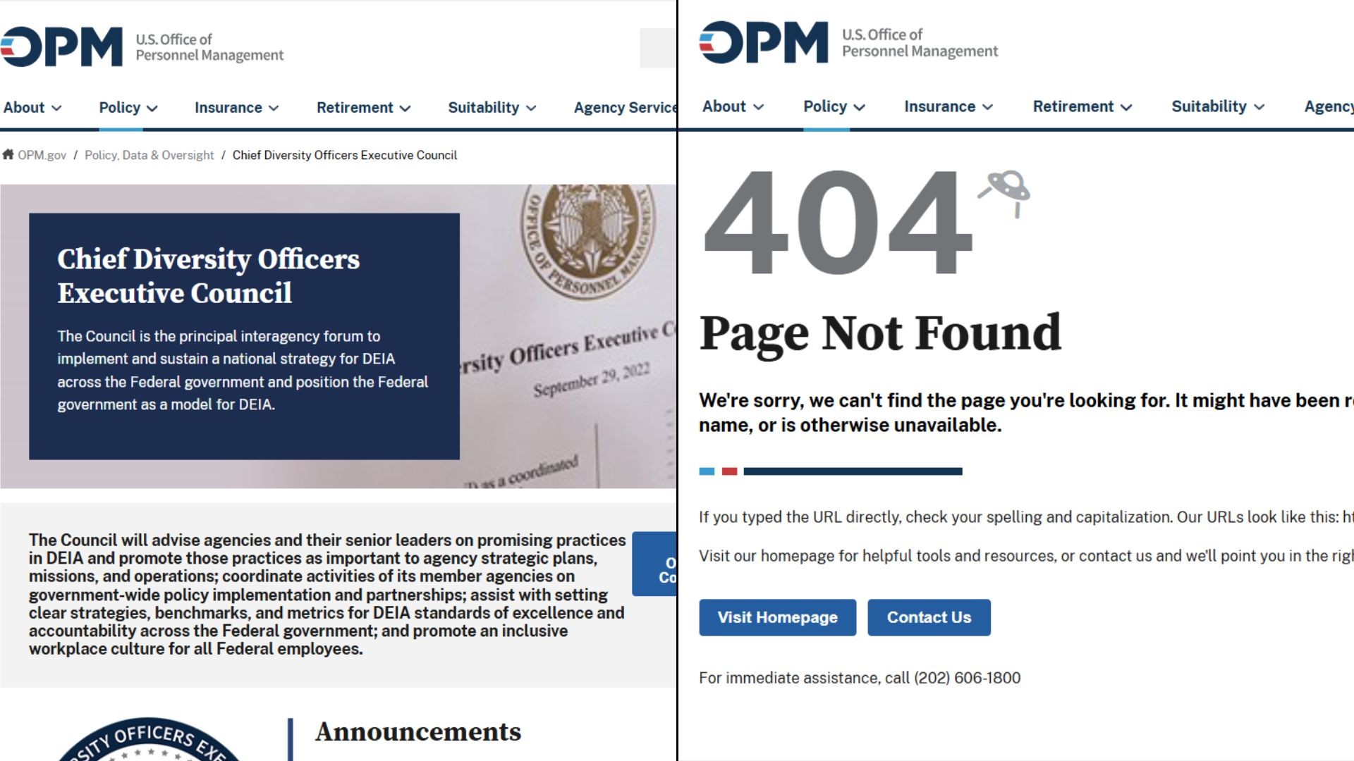 O site do Conselho Executivo de Diretores-Chefes de Diversidade amanheceu aparecendo o “erro 404”, de página não encontrada. O Conselho tem como objetivo promover práticas de diversidade, equidade, inclusão e acessibilidade e aconselhar outras agências governamentais dos EUA sobre como as implementar.