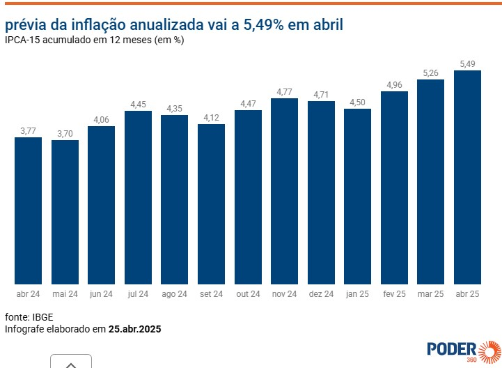 Considerado a prévia da inflação, o IPCA-15 (Índice Nacional de Preços ao Consumidor Amplo 15) acumulado em 12 meses acelerou para 5,49% em abril. Havia sido de 5,26% no período anualizado até o mês anterior.