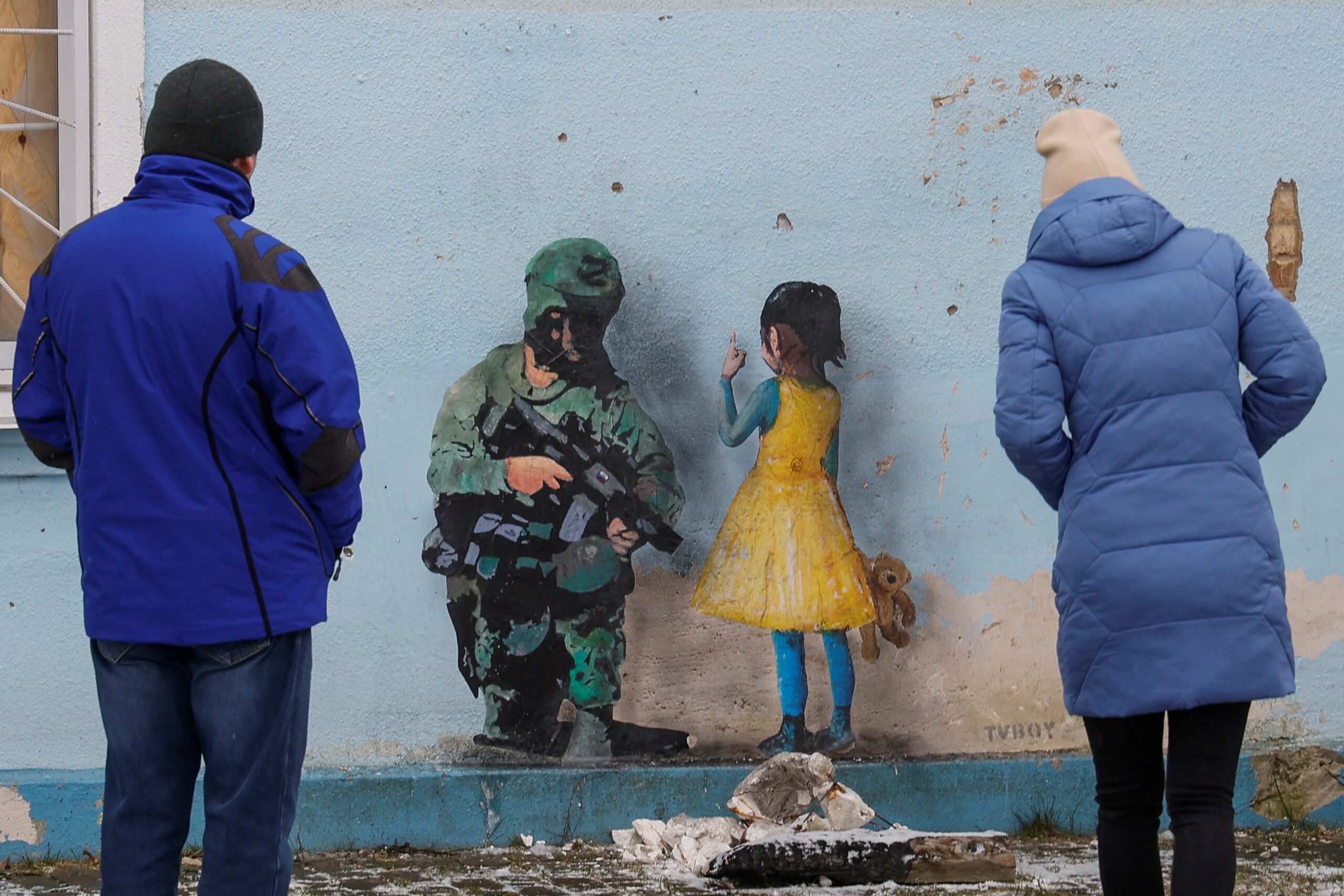 Pessoas observam obra de Tvboy na parede da casa da cultura de Irpin, perto de Kiev, na Ucrânia: com o dedo em riste, uma menina com um urso de pelúcia na mão, vestida com as cores da bandeira ucraniana, fala com um soldado armado — Foto: Valentyn Ogirenko/Reuters