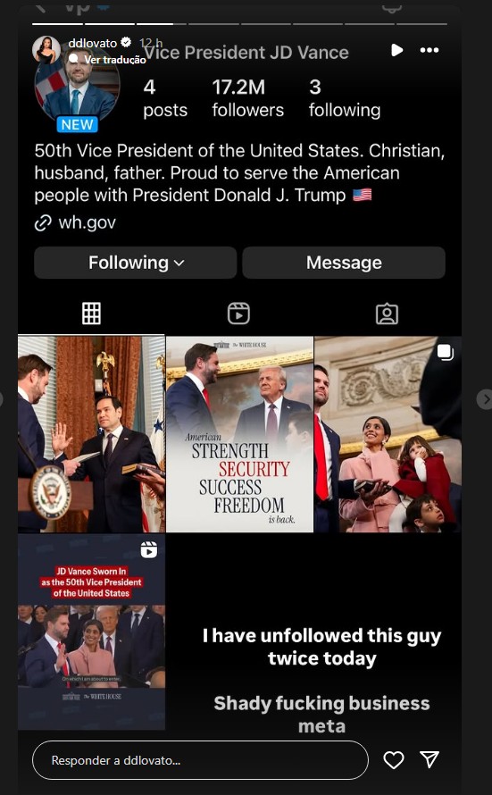 Outros disseram que estão dando ‘unfollow’ nos perfis e, um tempo depois, aparecem novamente como seguidores. A cantora Demi Lovato disse que isso aconteceu com ela no caso da conta @vp, de J.D. Vance.
